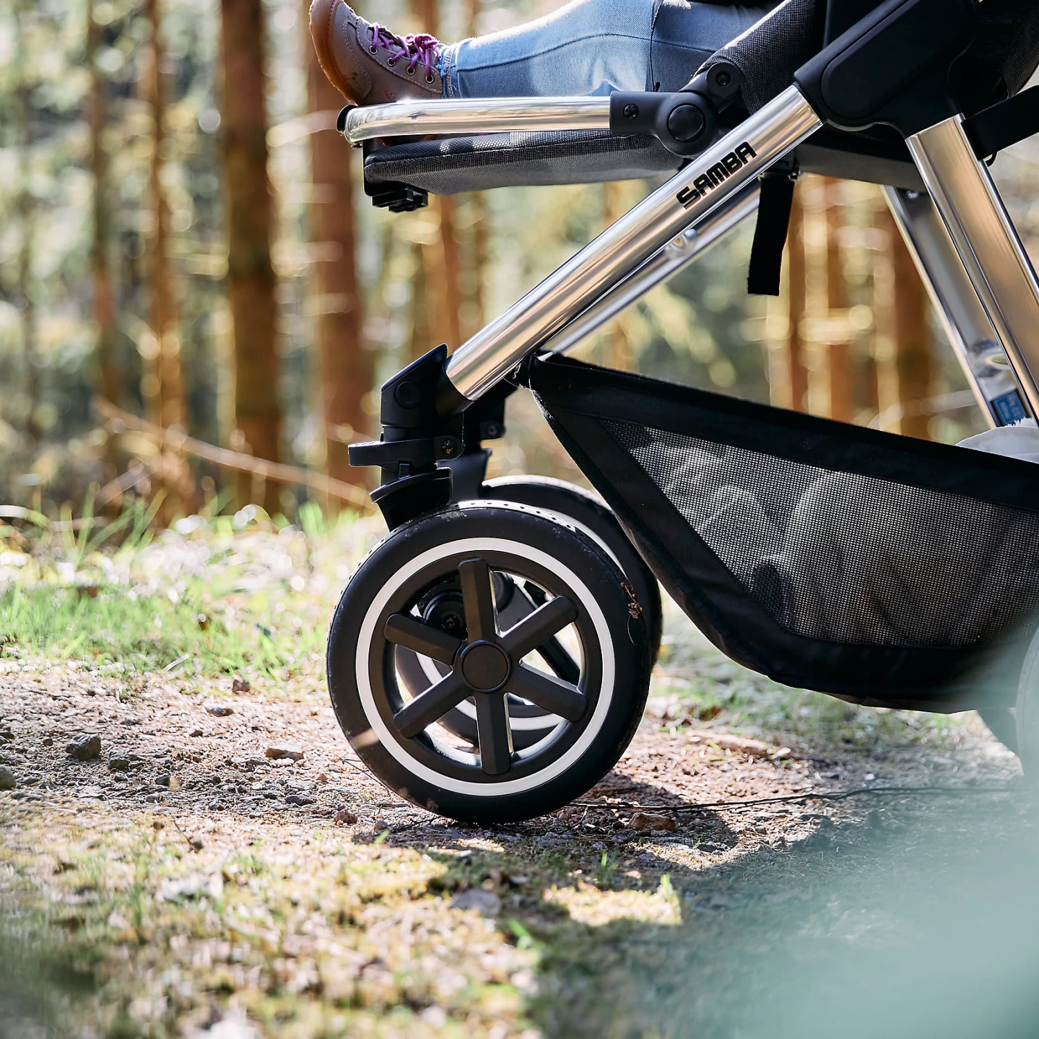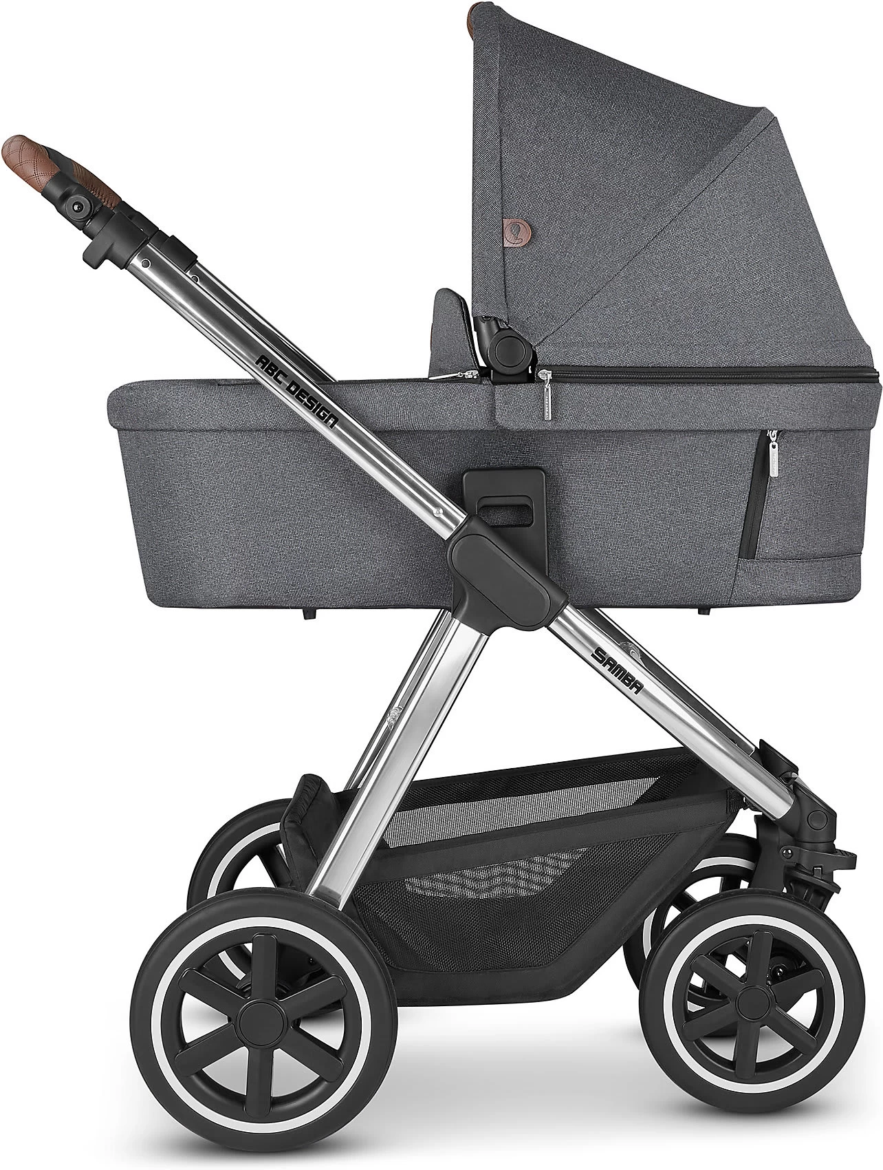 Der ABC Design Kombi-Kinderwagen „Samba“ begleitet Familien besonders flexibel im Alltag. Babys haben es anfangs im Kinderwagenaufsatz auf der ergonomischen, keilförmigen Matratze sehr gemütlich. Später können sie die Welt vom Sportsitz aus erkunden. Auch die ABC Design Autobabyschale kann mit dem passenden Adapter auf dem Gestell befestigt werden.