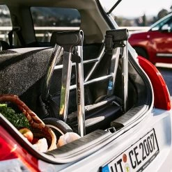 Der sehr leichte Wagen lässt sich besonders kompakt zusammenfalten, so dass er in jeden Kofferraum passt. Die Transportsicherung verhindert, dass er sich unbeabsichtigt aufklappt. Der Tragegriff sowie der integrierte Gurt erleichtern den Transport zusätzlich. Auch bleibt er aufrecht stehen, wenn er abgestellt wird.