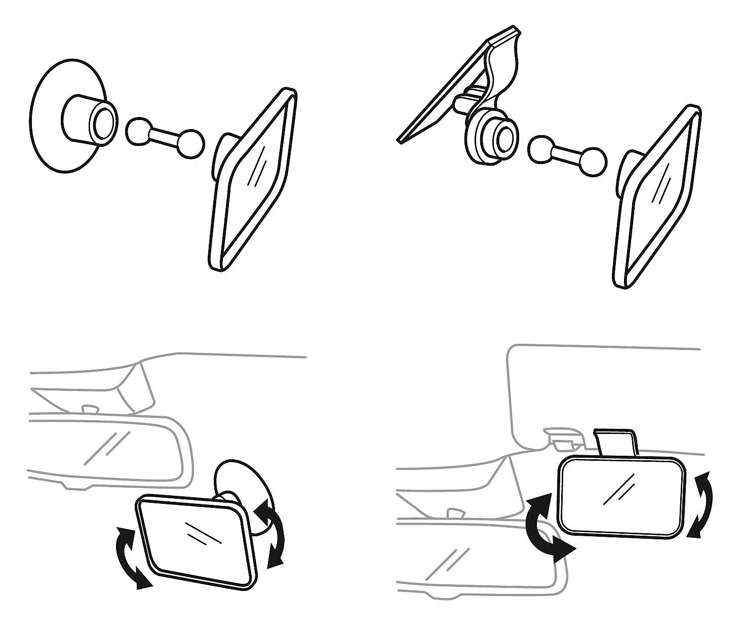 Der praktische Autospiegel lässt sich einfach und schnell mit der Klammer oder dem Saugnapf an der Frontscheibe oder der Sonnenblende befestigen. Dank des Kugelgelenks lässt sich der Spiegel optimal ausrichten, so haben Sie Ihren Schatz auf der Rückbank auch während der Autofahrt stets im Blick.