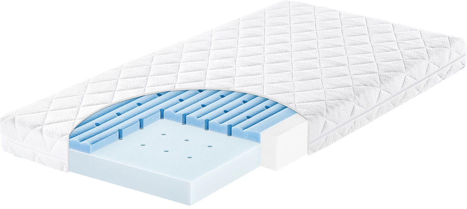 Die zweischichtige Babymatratze Blue Wave von ZÖLLNER bietet hervorragenden Schlafkomfort durch den Einsatz von einer formstabilen Matratzenbasis und einem anschmiegsamen Topper aus Kaltschaum mit Wellenprofil. Der atmungsaktive Kaltschaum und die vertikalen Ventilationskanäle sorgen für ein perfektes Schlafklima. Die Wirbelsäule wird dank der zwei Schaumschichten optimal unterstützt. Die trittfesten Längskanten sorgen für Sicherheit bei den ersten Stehversuchen.