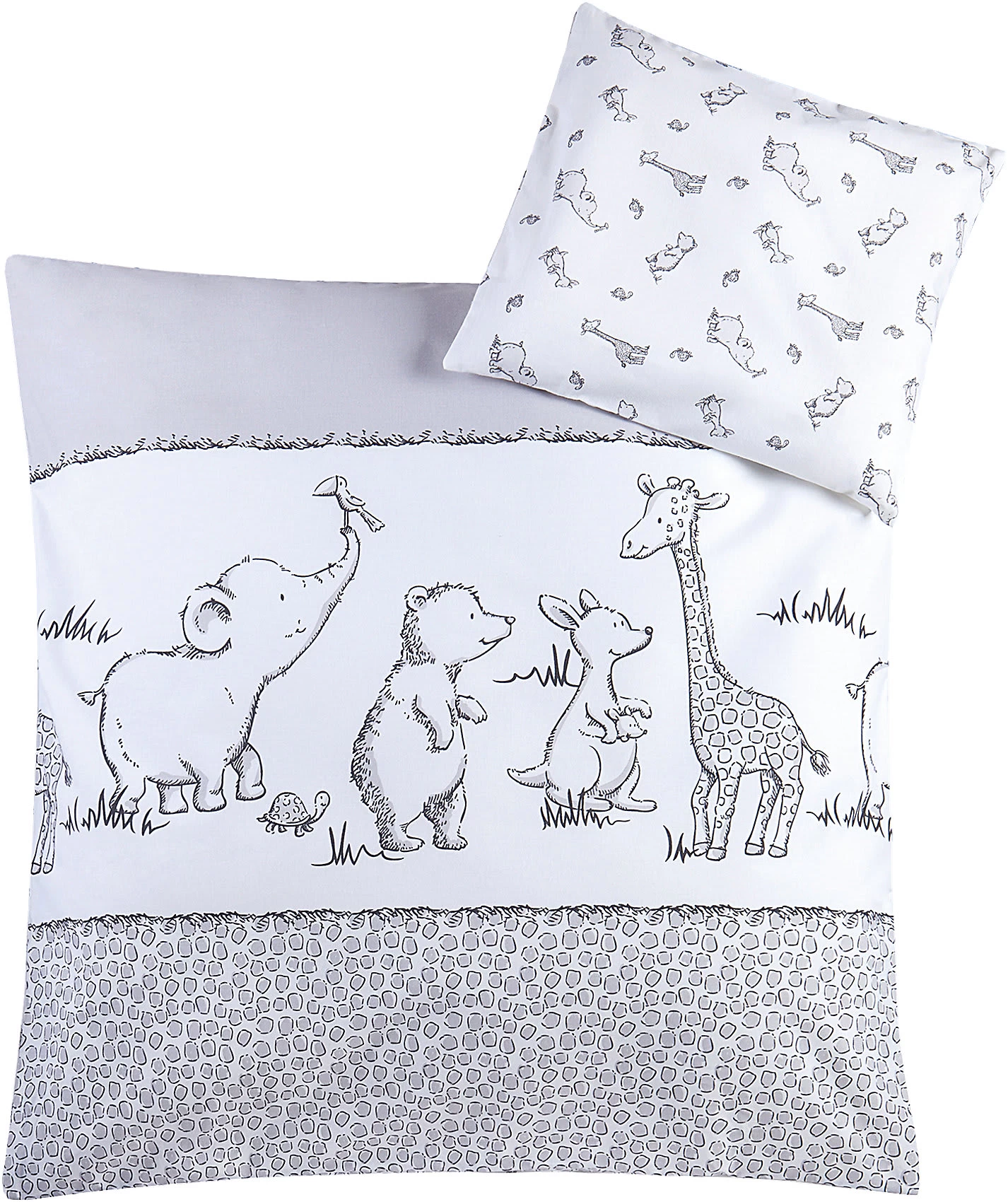 Die Babybettwäsche mit den lustigen Tiermotiven von Zöllner für Kinderwagen und Stubenwagen passt durch ihr schlichtes Design und die Farbgebung in jedes Babyzimmer.