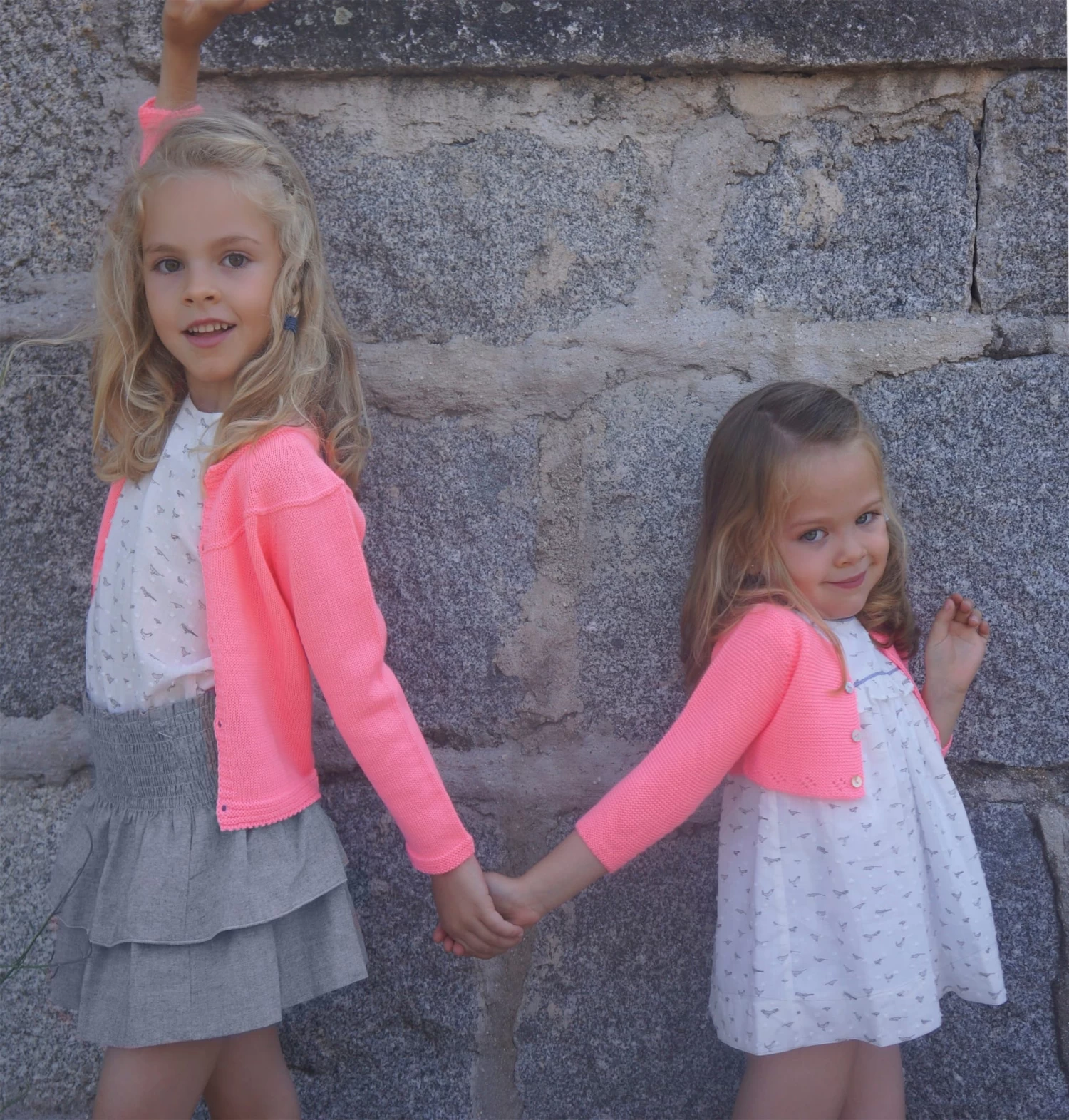 Eine zauberhafte Mädchenstrickjacke in Neonrosa für den Sommer. Diese kurze glattgestrickte Strickjacke ist speziell für das 4nenes Plumetis Baby-Kleid mit Vogelmuster kreiert worden.