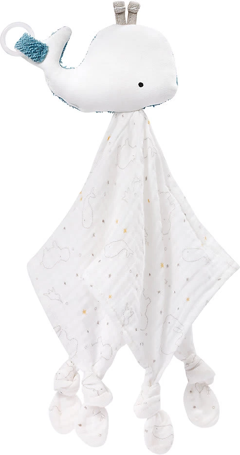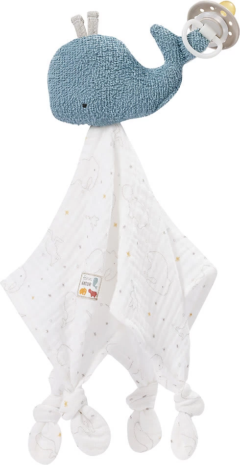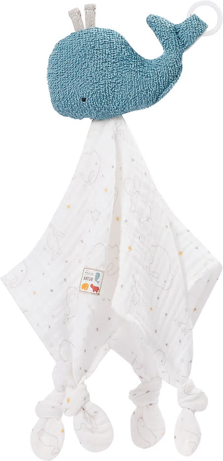 Das niedliche Schmusetuch von Fehn ist Tröster, Wärmespender, Einschlafhilfe und Kuschelfreund in einem – und das aus nachwachsenden Rohstoffen. Schmusetuch Wal von Fehn fehnNATUR-Kollektion 34 cm groß Schnullerbefestigung Obermaterial aus Bio-Baumwolle (kbA – kontrolliert biologischer Anbau), Füllung mit PLA-Fasern aus nachwachsenden Rohstoffen ab Geburt geeignet Das Schmusetuch ist ein echter Umweltheld: Der Stoff ist aus Bio-Baumwolle gefertigt, die Füllung aus bio-basierten PLA-Fasern aus nachwachsenden Rohstoffen. Dank der verschiedenen Oberflächen und Knoten ist der Wal nicht nur ein kuscheliger Begleiter, sondern fördert auch den Tastsinn der Kleinen. Der praktisch Befestigungsring sorgt dafür, dass der Schnuller immer in greifbarer Nähe ist. Sollte das Schmusetuch mal dreckig werden, kann es bequem in der Maschine gewaschen werden.