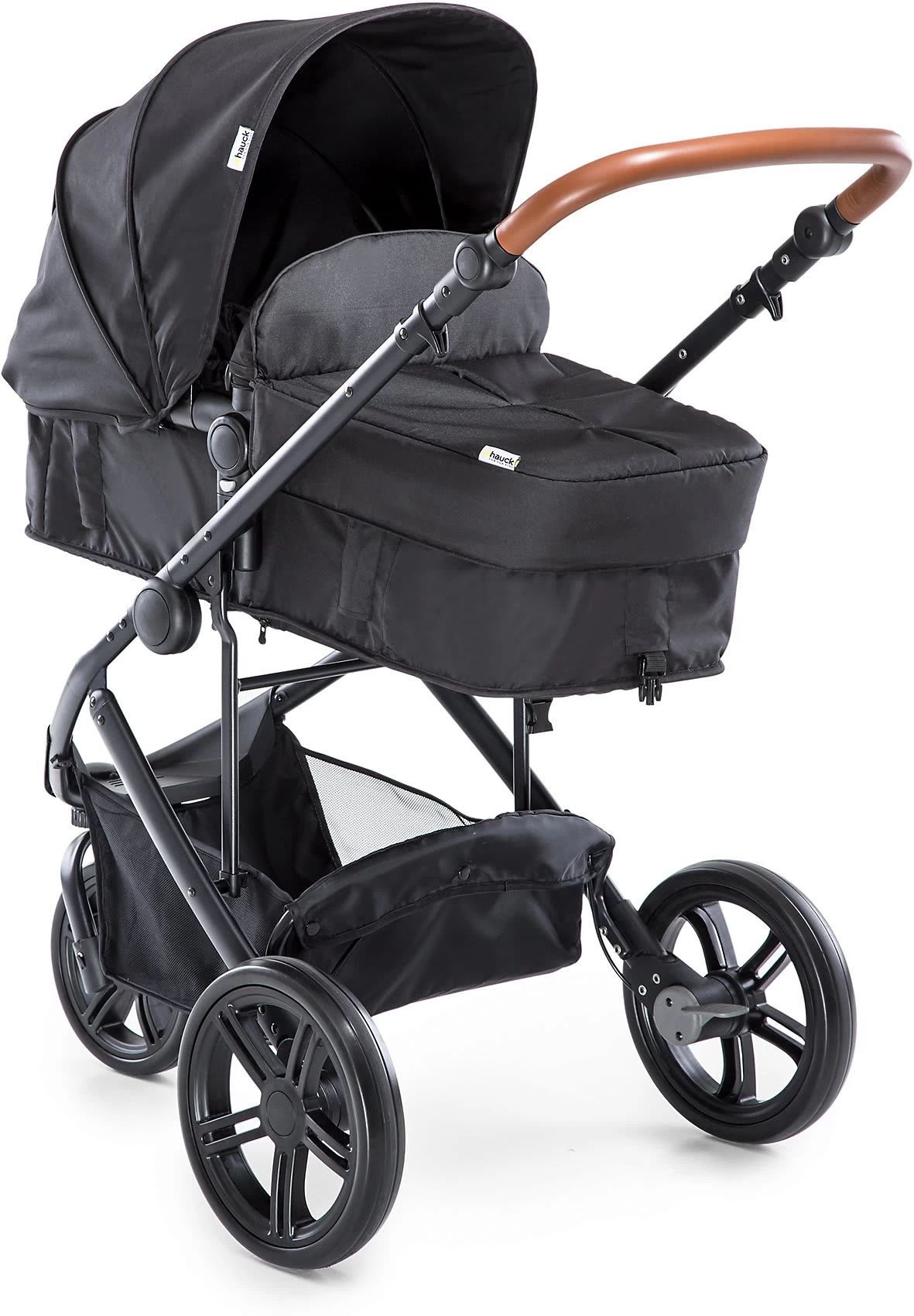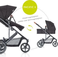 Der Hauck Kombi Kinderwagen „Pacific 4 Shop N Drive“ stattet Sie für alle Eventualitäten aus und ist der perfekte Begleiter im Babyalltag. Geliefert werden ein Kinderwagenaufsatz, der auch zum Sportwagenaufsatz umgewandelt werden kann, und die Babyschale Zero Plus. Sie lässt sich einfach mit einem Klickmechanismus befestigen. In Kombination mit dem Kinderwagengestell entsteht so ein praktisches Travelsystem, das sich durch Flexibilität auszeichnet. Darüber hinaus kann die Babyschale natürlich auch im Auto genutzt werden. Auch in der Tragewanne liegt Ihr Neugeborenes stets geschützt und sicher. Ist Ihr Kind älter, sitzt es im umsetzbaren Sportwagen entweder in oder entgegen der Fahrtrichtung. Die Wannenabdeckung kann dabei als Fußsack oder Sitzeinlage genutzt werden. Vor Sonneneinstrahlung, Wind und Regen schützt das große Sonnendach.