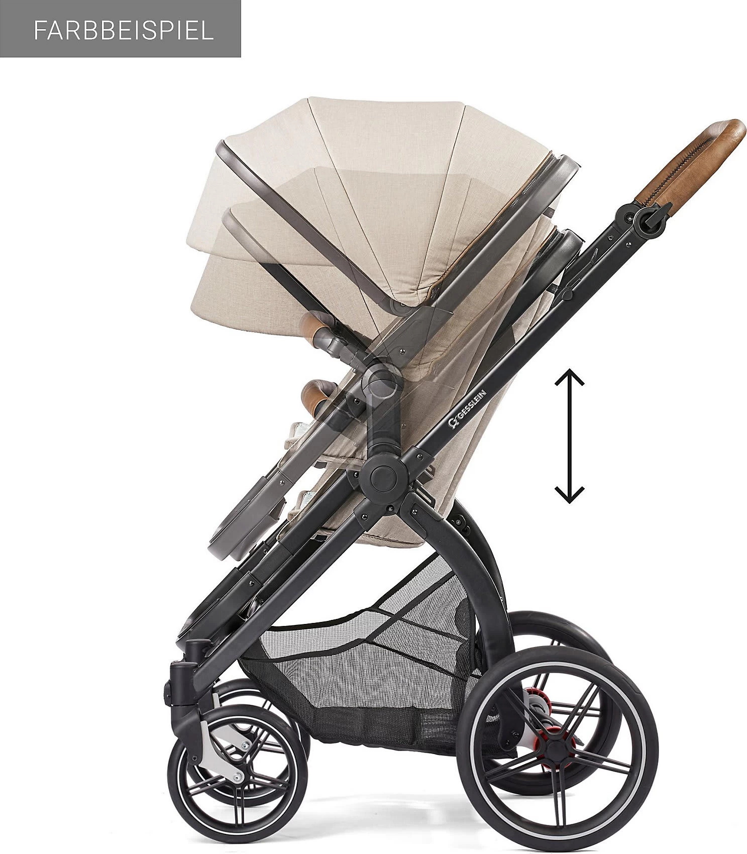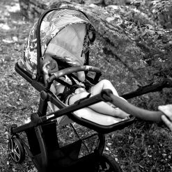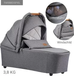 Beide Aufsätze verfügen über ein verstellbares Verdeck, dass vor direkter Sonneneinstrahlung schützt. Dank des Fenster mit Netzeinsatz ist für eine angenehme Belüftung gesorgt. Eine Ablagefläche unten bietet Platz für benötigte Utensilien oder auch die täglichen Einkäufe. Der mitgelieferte Adapter ermöglicht die Nutzung des Kinderwagens als Travelsystem, das Eltern die maximale Flexibilität im Alltag ermöglicht.