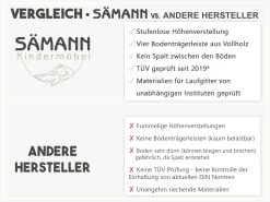Da uns die Sicherheit Ihres Kindes am Herzen liegt, prüfen unsere Schreinermeister die Einhaltung der genannten DIN-Normen in regelmäßigen Abständen. Diese fordern wir regelmäßig bei unseren Zulieferern an, um so ein hohes Maß an Sicherheit gewährleisten zu können.