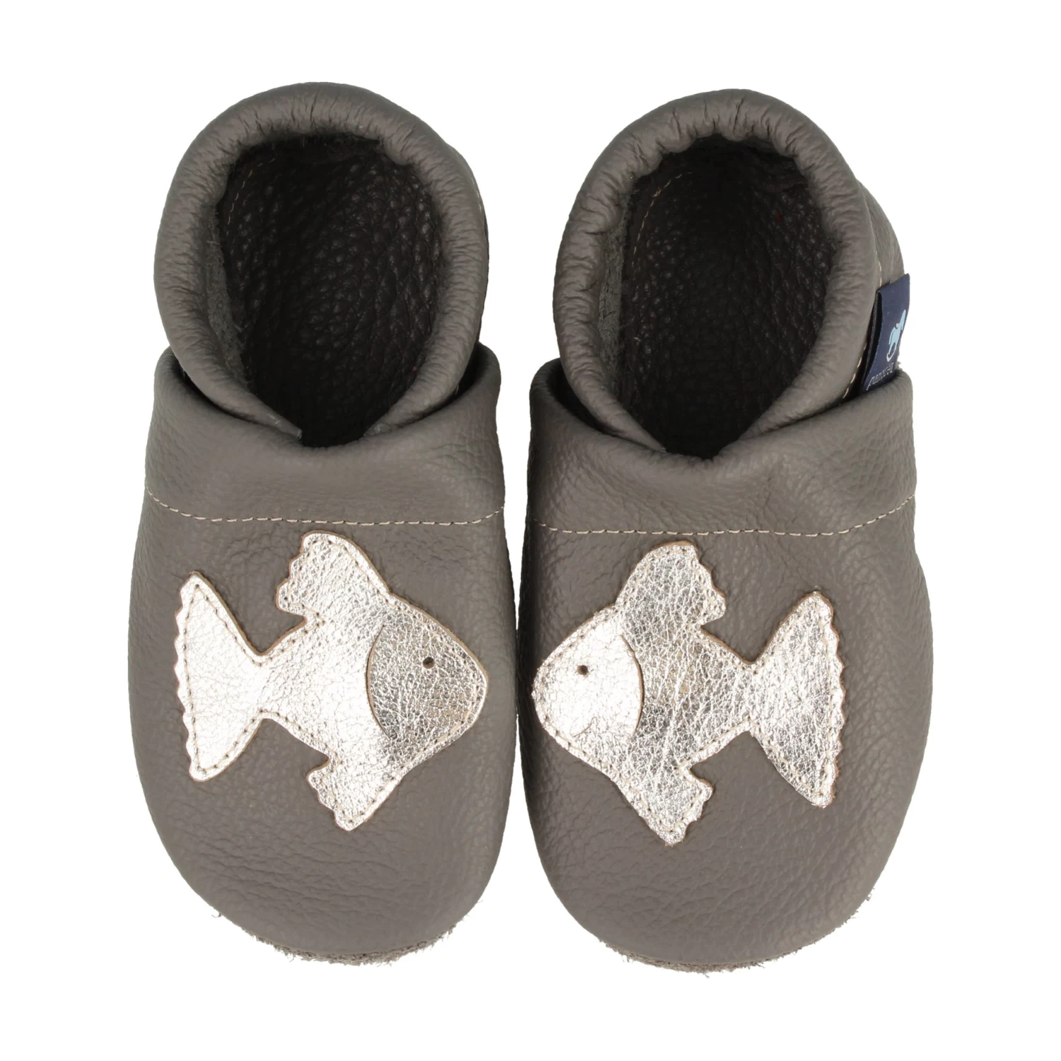 Lauflernschuhe / Lederpuschen Mit Fisch In Grau / Silber