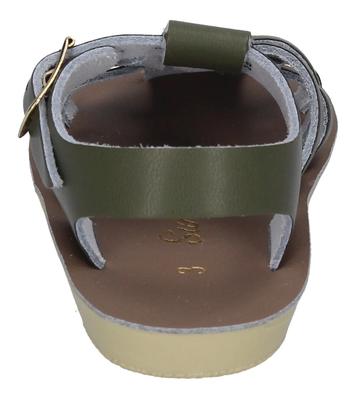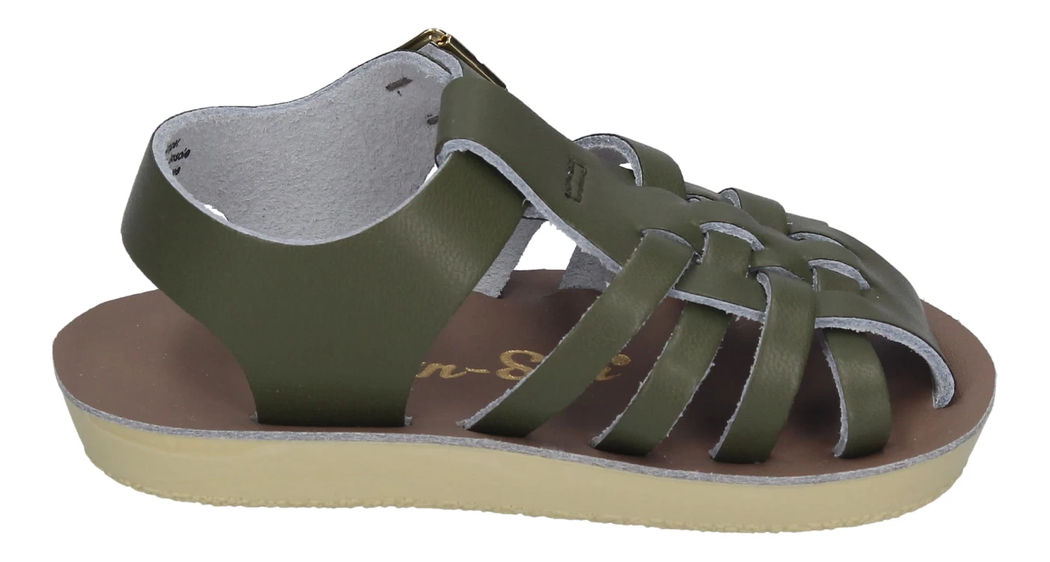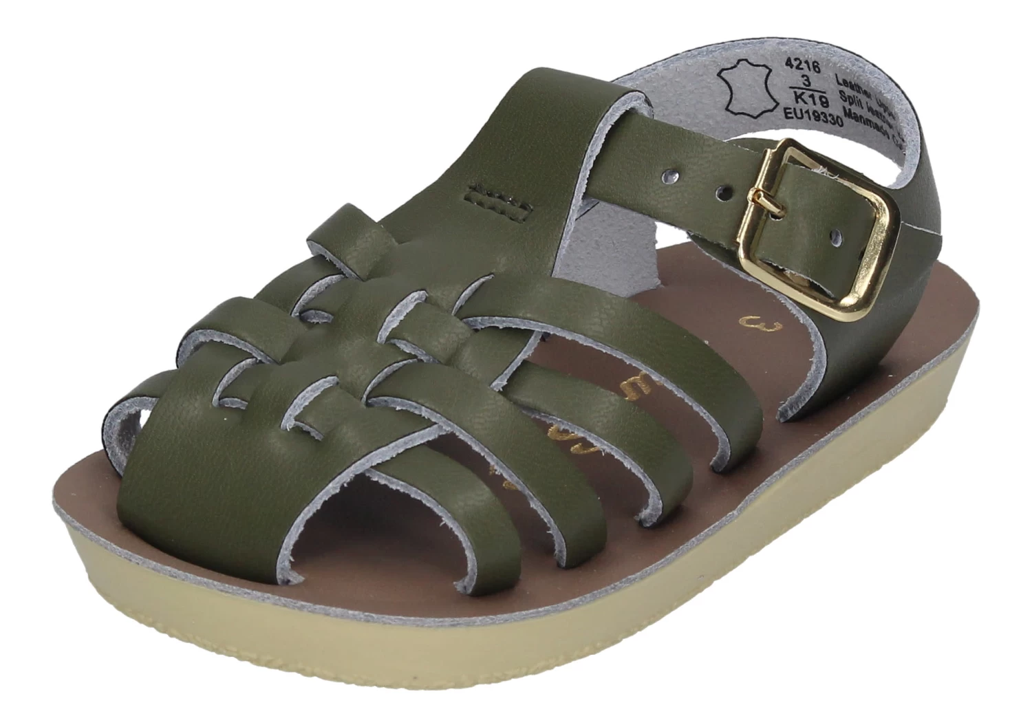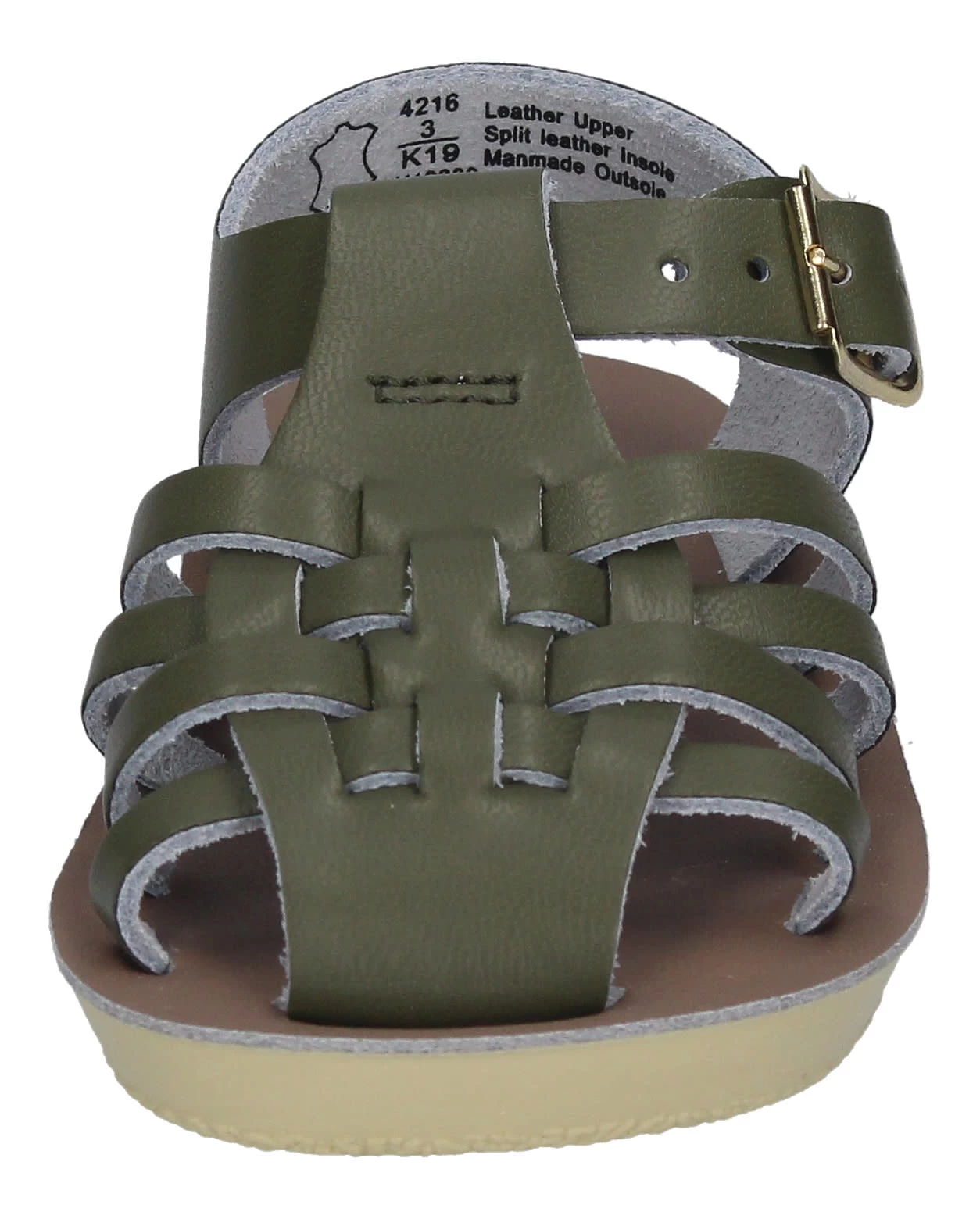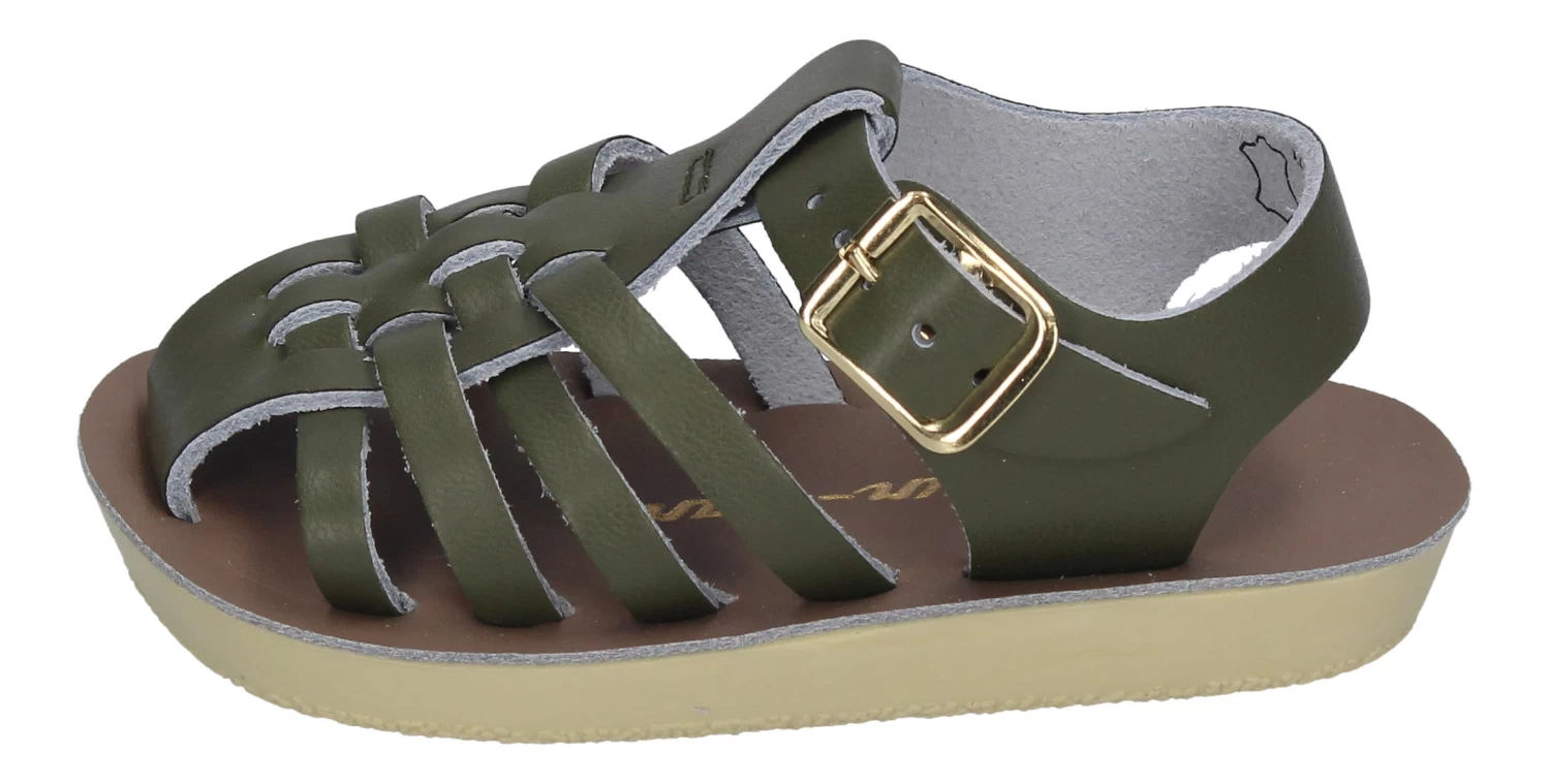 Die Marke Salt Water Sandals gibts schon seit den 1940er Jahren. Die Sandale Sailor in olivegrün ist die Mini-Version eines Bestsellers der Marke. Die Lauflernschuhe sind zum Schutz der kleinen Zehen vorn geschlossen. Das Leder ist auch bei diesen Schühchen salzwassertauglich und hat überdies eine angenehm weiche Sohle.