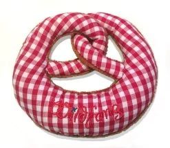 Henry liebt Brezen über alles und hätte gerne immer eine dabei. Damit ihm seine Mama nicht ständig eine neue kaufen muss, bekommt er jetzt eine, die immer frisch bleibt, überall dabei sein kann und auch noch rasselt. Sie hat hinten auch noch ein schickes Trachtenkaromuster aus 100% Baumwolle, damit er nicht vergisst, dass sie zum Spielen und nicht zum Essen ist.