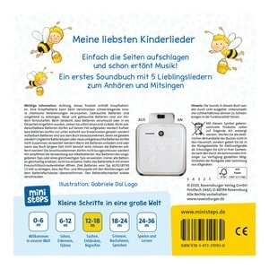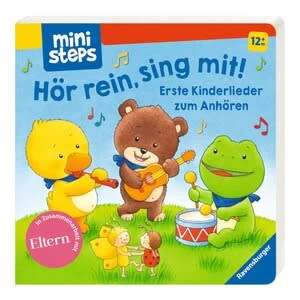 Hör rein, sing mit! Dieses Soundbuch von Ravensburger mini steps bringt fünf Kinderlieder zum Anhören und Mitsingen mit. ab 12 Monaten geeignet Soundbuch inkl. Batterien (3 x LR54 / AG10) 12 Seiten deutschsprachig Fünf Kinderlieder erklingen wie durch Zauberei, wenn die passende Seite aufgeschlagen wird. So können schon Einjährige ihr Lieblingslied selbst aussuchen und ohne Hilfe anhören. „Alle meine Entchen“, „Backe, backe Kuchen“, „Bruder Jakob“, „Summ, summ, summ“ und „Schlaf, Kindlich, schlaf“ sind für Kleinkinder der ideale Einstieg in die spannende Welt der Musik!