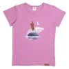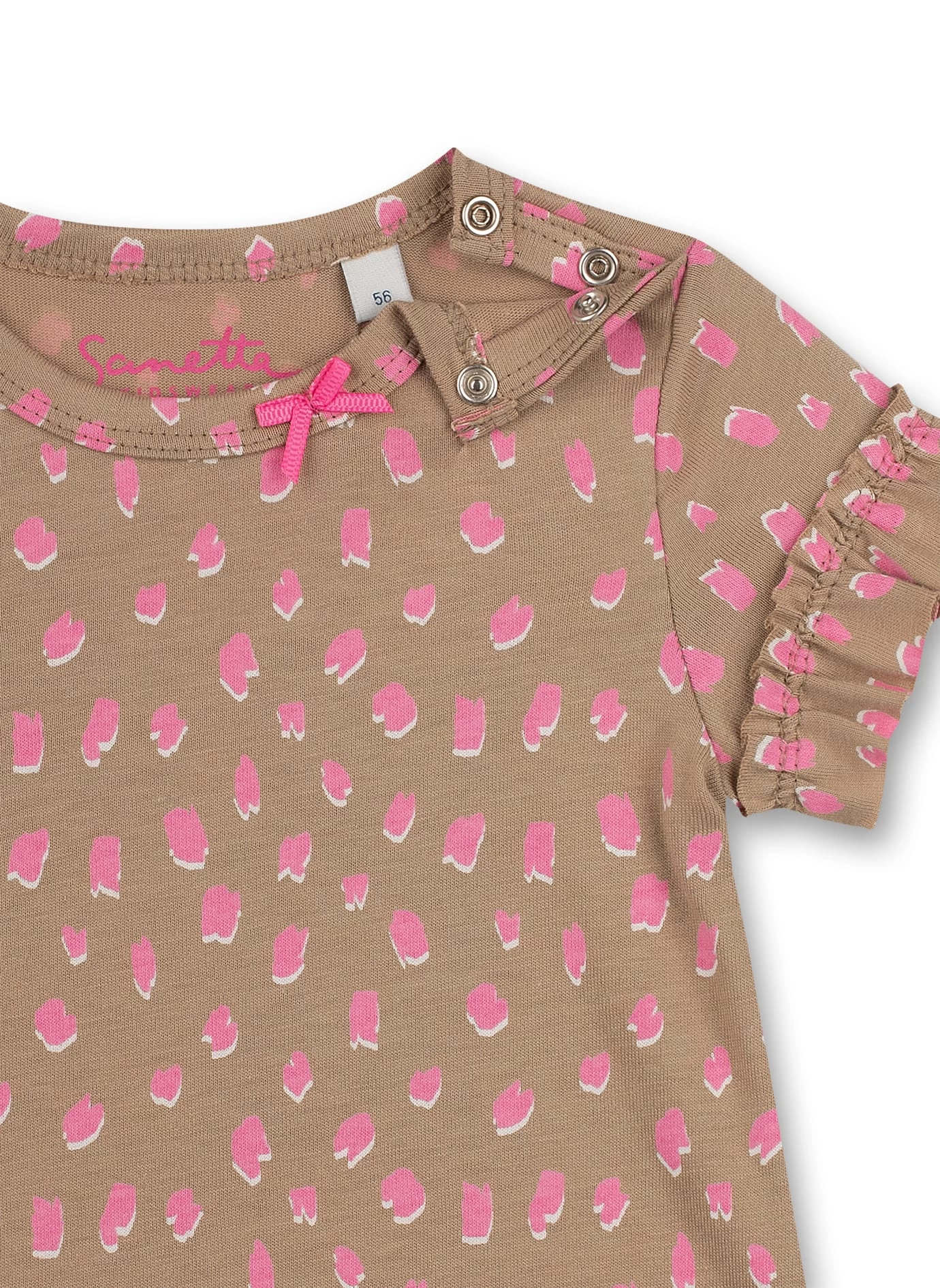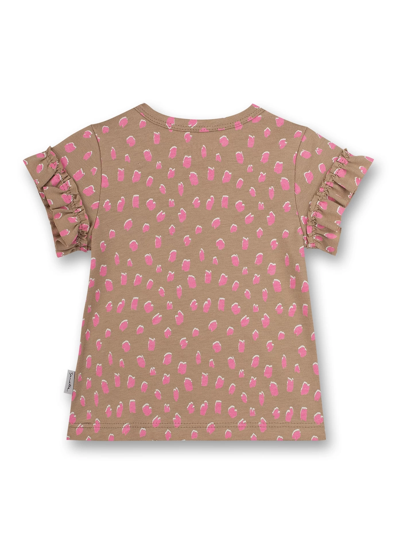 Verspielt gestaltetes sandfarbenes Mädchen T-Shirt mit zarten Rüschen und bunten Tupfer-Artworks von Sanetta Kidswear.