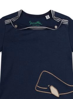 Süßes Jungen T-Shirt in einem klassischen Dunkelblau mit einem seitlichen Wal-Artwork mit Flossen-Applikationen.