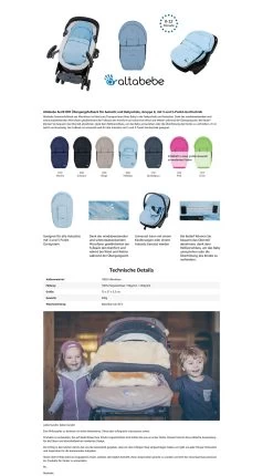 Altabebe Sommerfußsack aus Mikrofaser ist ideal für alle gängigen Autositze. Dank der winddichten und schmutzabweisenden Mikrofaser bietet der Fußsack Komfort und Wärme während der Übergangszeit. Der obere Teil kann nach Bedarf entfernt werden (dank des Reißverschlusses) und somit wird das Baby gegen die Überhitzung geschützt. Der Fußsack ist universell und kann in allen Autositzen mit 3 und 5 Punkt Gurtsystem verwendet werden. 0-12 Monate. Außenmaterial: 100% Mikrofaser. Füllung: 100 % Polyesterfaser 150g/m2+250g/m2
