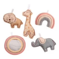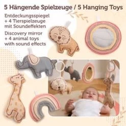 Der Spielbogen von Hakuna Matte begeistert mit Hängespielzeugen zum Sehen, Hören und Fühlen und einer Spieldecke zum Wohlfühlen. Spielbogen mit Decke von Hakuna Matte Spieldecke mit Regenbogen-Print, überkreuzter Spielbogen mit 5 Hängespielzeugen Geräusch-Effekte Ø 85 cm, 3 cm hoch geruchlos, frei von Phthalaten und AZO-Farbstoffen ab Geburt geeignet Der Spielbogen besteht aus zwei überkreuzten Bögen und einer Spieldecke zum Wohlfühlen: Mit einer Dicke von 85 Zentimetern bietet die Decke Deinem Baby ausreichend Platz. Eine Dicke von drei Zentimetern lässt Dein Kleines angenehm weich liegen. Für ein Plus an Komfort sorgen die hypoallergenen und atmungsaktiven Materialeigenschaften. Der Spielbogen selbst besteht aus zwei überkreuzten Bögen. Die fünf hier angebrachten Hängespielzeuge wecken bereits in Rückenlage die Neugier Deines Babys. Kommt es in Bauchlage, laden sie zum Sehen, Fühlen und Hören ein: Ein Regenbogen, ein Elefant, ein Löwe sowie eine Giraffe aus Plüsch begeistern mit Raschel-, Rassel- und Quietsch-Geräuschen. Im Spiegel kann es sich selbst und seine Umgebung entdecken. So bietet der Spielbogen jede Menge Spaß für Dein Baby – und fördert ganz nebenbei die Entwicklung seiner Nacken- und Rumpfmuskulatur, seine Motorik sowie seine Hand-Augen-Koordination.