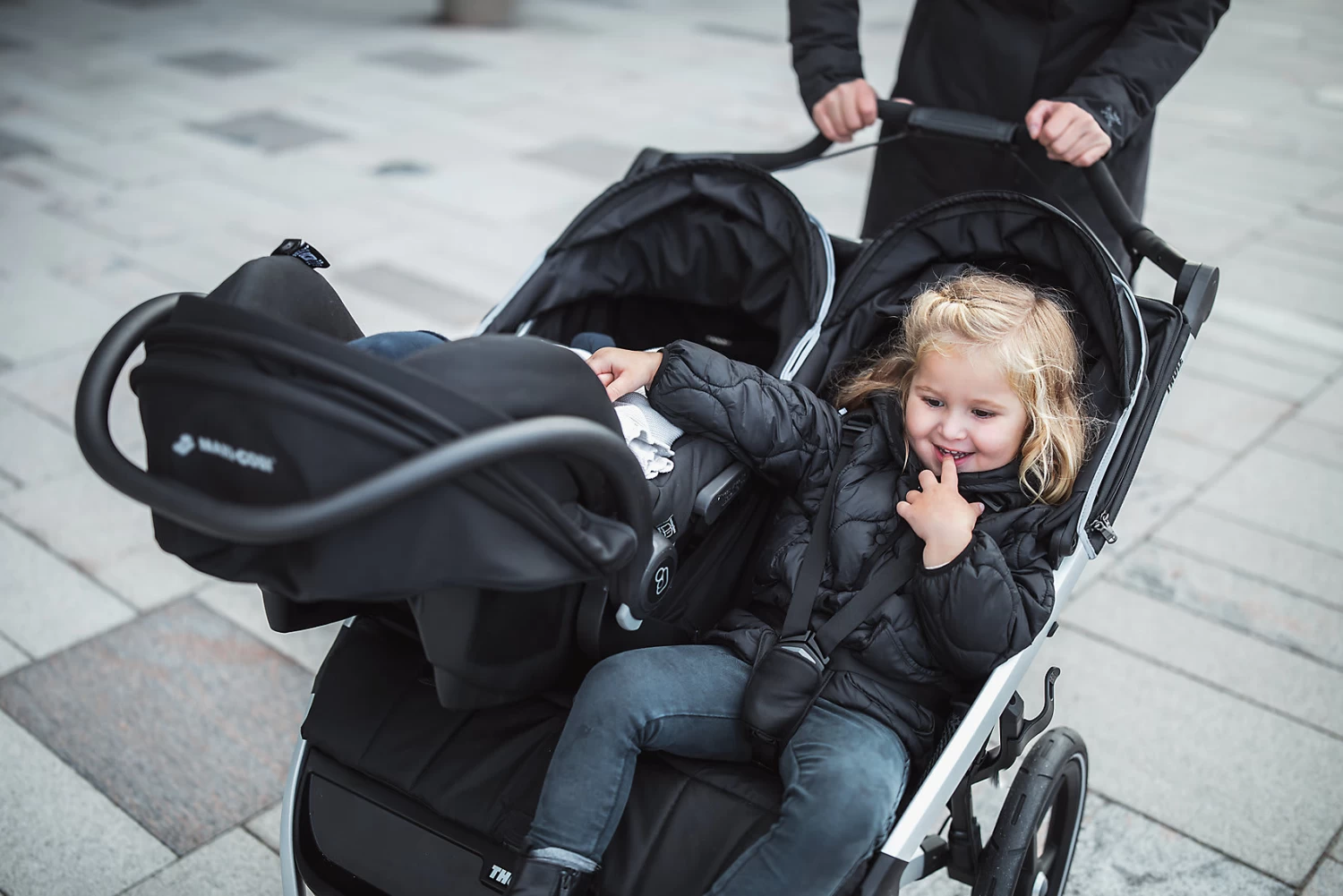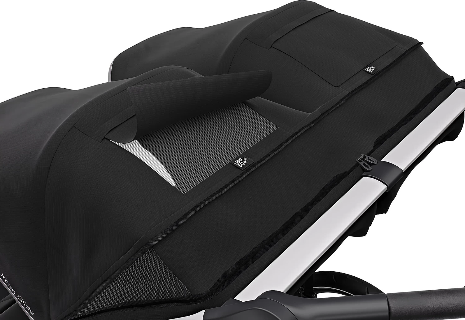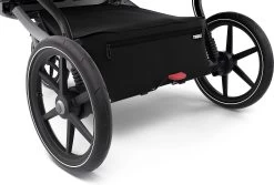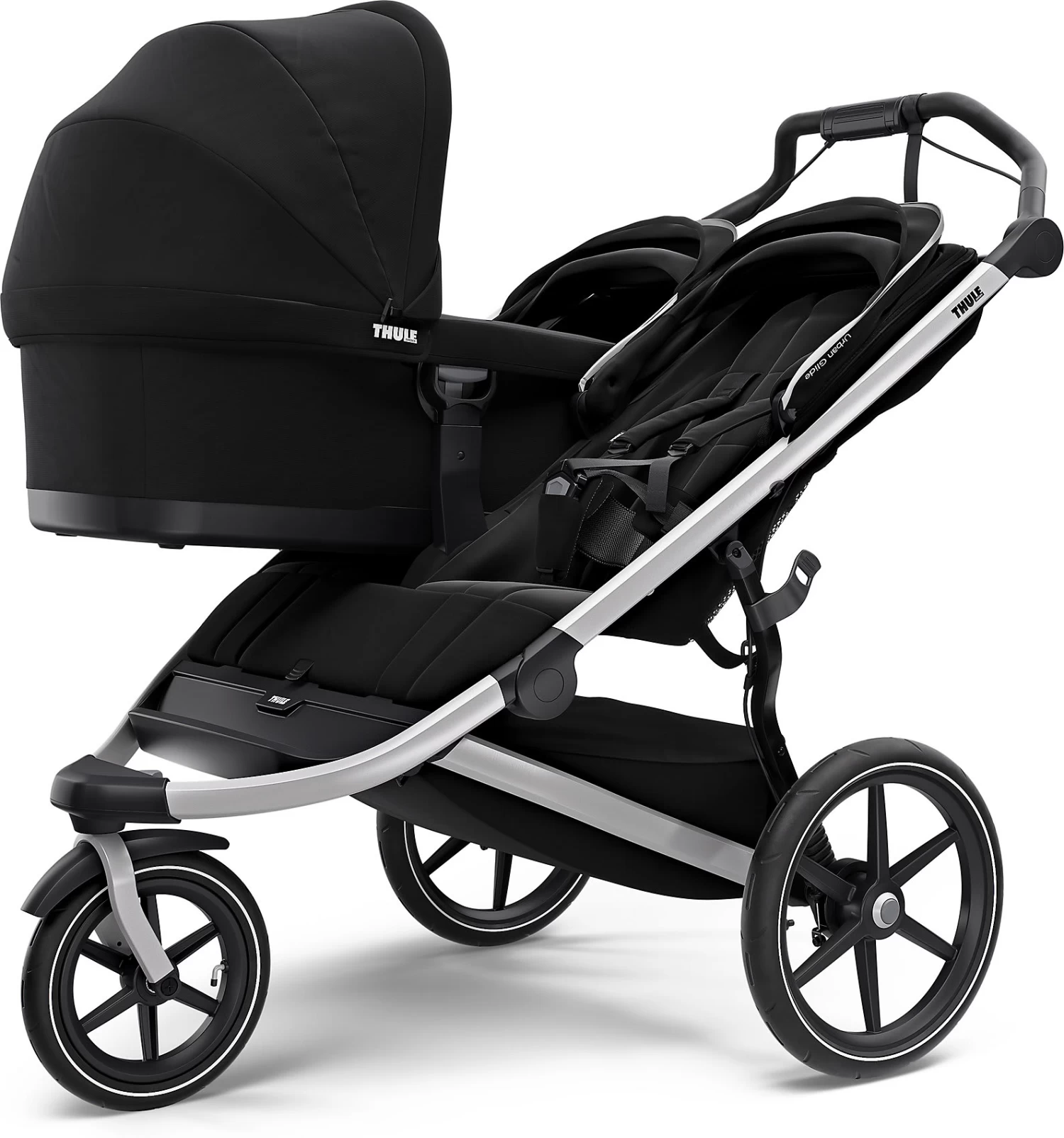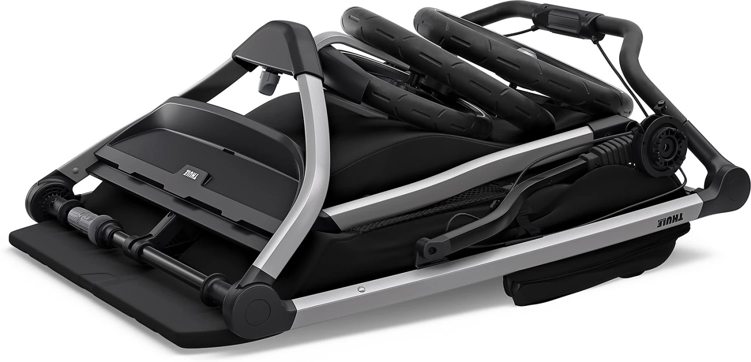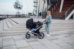 Der Zwillings-und Geschwisterwagen Thule Urban Glide 2 Double ist ein sportiver Begleiter, der sowohl für die Kinder als auch die Eltern hohen Komfort bereithält. So sorgt die Federung bei Eltern und Kindern für eine angenehme Fahrt. Der Schiebebügel kann so eingestellt werden, dass sich das Schieben rückenfreundlich und komfortabel gestaltet. Dank schwenkbarem und feststellbarem Vorderrad kann man mit dem Buggy sogar joggen gehen. Die integrierte Drehgriffbremse ermöglicht eine gute Kontrolle der Geschwindigkeit auch in hügeligem Gelände. Reflektierende Elemente an den Felgen sowie am Verdeck verbessern die Sichtbarkeit im Dunkeln. Ein am Verdeck angebrachtes, transparentes Fenster mit Magnetverschluss erlaubt es Eltern, die Kinder beim Schlafen im Blick zu behalten, ohne sie zu stören. Außerdem ist das Verdeck verstellbar und verfügt über Belüftungsfenster. In den Sitz ist ebenfalls eine Belüftung integriert. Der gepolsterte Gurt erhöht den Komfort im bequemen Sitz zusätzlich. Wird es Zeit für ein Nickerchen, kann der Sitz problemlos und mit einer Hand in eine Liegeposition gebracht werden. Viel praktischen Stauraum bieten der großzügige Korb, die Netztasche und die seitlichen Netzfächer. Der Buggy kann ganz einfach mit einer Hand zusammengeklappt und somit gut transportiert und verstaut werden.