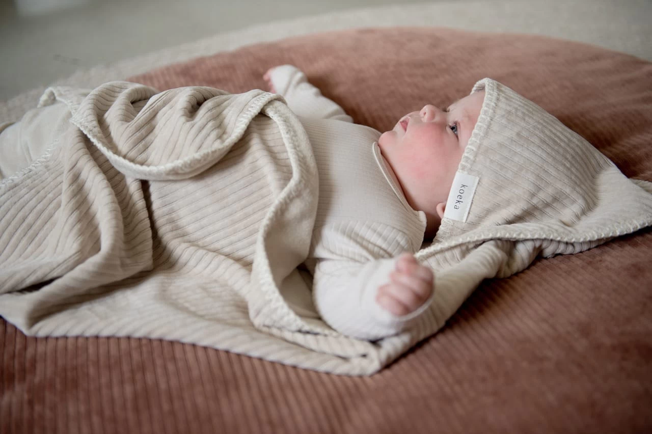 Das Koeka Umschlagtuch mit Kapuze ist mit Frottee gefüttert und kann zum EinWickeln deines Babys verwendet werden. Dieses Umschlagtuch hat eine Öffnung, so dass es auch mit den Gurten des Autositzes oder der Wippe verwendet werden kann. So ist deinem Baby zu Hause und unterwegs immer angenehm warm. Das Einwickeltuch ist auch beim Füttern praktisch. Mit der Aufhängeschlaufe ist das Handtuch im Bade- oder Kinderzimmer immer griffbereit. Du kannst das Einwickeltuch auch mit zum Kinderarzt nehmen; ideal, wenn man auf den Termin warten muss.